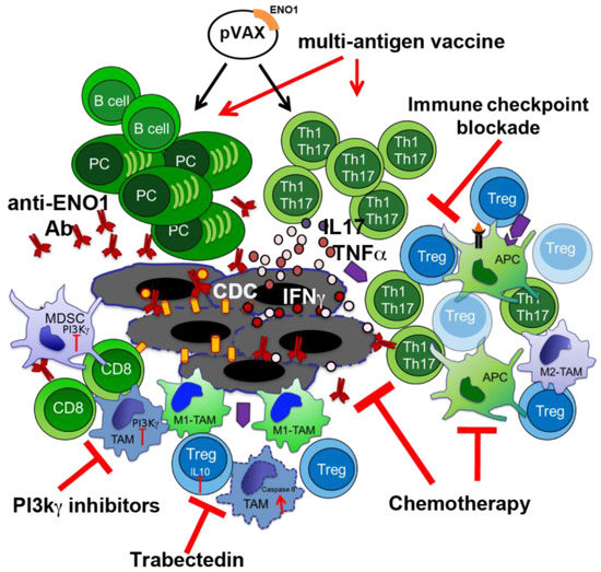 Developing strategies focused on the inhibition of myeloid cell-mediated immune suppression, such as the use of checkpoint and/or other inhibitors can be of interest. All anti-tumor restoring effects of PI3K inhibitors strongly suggest that small pharmacological inhibitors that target PI3Kγ or δ isoforms or all isoforms together can be a suitable powerful combinatorial partner to enhance the antitumor efficacy of ENO1 vaccination (Figure 4). Despite only 20% of PDA patients displaying an increased activation of AKT/mTOR in tumor cells [57], the cited inhibitors directly impact leukocytes, and myeloid or Treg cells in particular. Although PI3K inhibitors down-regulate AKT activation and influence the regulation of downstream genes, included glycolytic enzymes as ENO1 [58], this will not affect tumor cells. Therefore, there are no potential restrictions for treatable patients.