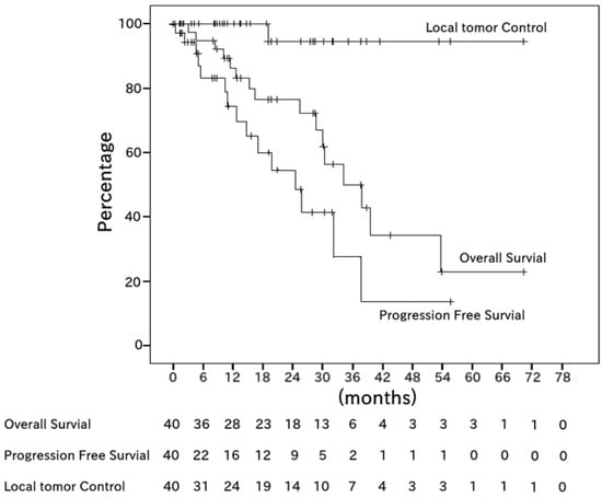 Kaplan–Meier estimates of overall survival (OS), progression-free survival (PFS), and local tumor control (LTC) among all 40 patients. The median OS period was 20.8 months (range, 1.3–72.3 months). The median PFS period was 9.8 months (range, 0.0–57.2 months). The 2-year OS, PFS, and LTC rates were 76%, 60%, and 94%, respectively.