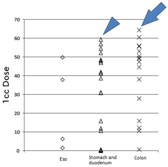 The 1-cc dose of the gastrointestinal tract. One case (arrowhead) involved a high dose (59.3 CGE) per 35 fractions to the stomach and duodenum, resulting in gastric hemorrhage with an ulcer treated by transfusion (grade 3). Another case (arrow) involved a high dose (64.4 CGE) per 20 fractions to the transverse colon without acute or late toxicity during the 3-year follow-up. Eso: esophagus, CGE: cobalt gray equivalent.