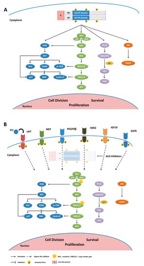 - Palmer, R.H.; Vernersson, E.; Grabbe, C.; Hallberg, B. Anaplastic lymphoma kinase: Signalling in development and disease. Biochem. J. 2009, 420, 345–361. [Google Scholar] [CrossRef] [PubMed]