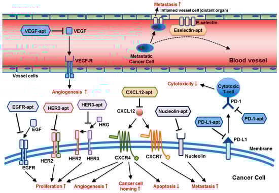 The broad range of molecular targets and targeting mechanisms of anti-cancer aptamers: Aptamers target multiple molecular pathways involving tumor progression and metastasis, including cancer cell proliferation, cell homing, apoptosis suppression, metastasis, impairment of T-cell cytotoxicity, and angiogenesis at different locations. (apt = aptamer).