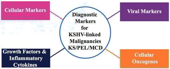 Summary of significant cancer diagnosis markers detected in Kaposi’s sarcoma-associated herpesvirus (KSHV)-associated neoplasms. These biomarkers can be categorized into virus specific markers (KSHV genome or specific proteins), cellular markers, cellular oncogenes, and inflammatory cytokines/growth factors.