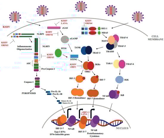 KSHV ORF63, a viral homolog of cellular NLRP1, reduces caspase-1 activity and lowers the production of “alarm” pro-inflammatory cytokines (Figure 4), IL-1β and IL-18, by altering the interaction between NLRP1 and pro-caspase 1 through its association with NLRP1 oligomerization domains. Additionally, ORF63 inhibits NOD2 and NLRP3 inflammasome responses to suppress NLR-mediated signaling []. Recently, the ubiquitously expressed NLRX1, a negative regulator of the type I IFN response has been shown to play an important role in KSHV reactivation from latency by inhibiting MAVS-dependent IFN-I signaling [].