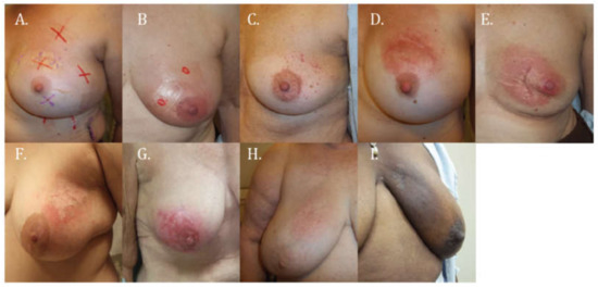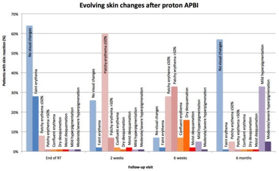 We considered there was room for further description of evolving acute skin changes and radiologic effects after proton APBI. Our objective was to perform a detailed description of evolving acute skin toxicity in patients with early-stage breast cancer treated with proton APBI and to correlate skin changes following radiotherapy with mammographic findings at six months.