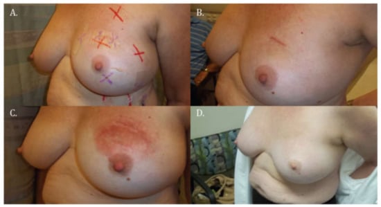 Medical photographs of one patient at selected follow-up visits showing a common skin reaction to proton APBI. No visual changes at (A) the end of radiotherapy or at (B) the two-week visit. (C) Patchy erythema in >50% of the treated skin area at six weeks, which (D) resolved showing no visual changes at 6 months. APBI, accelerated partial breast irradiation.