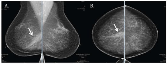 Mammographic evaluation showing (A) medio-lateral oblique and (B) cranio-caudal views of a common radiologic finding after proton APBI to the right breast at the six-month follow-up visit: post-surgical scar (arrow) and tumor bed clips.