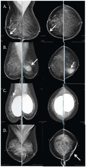 Six-month follow up mammograms showing (arrows) medio-lateral and cranio-caudal views of (A) skin thickening; (B) seroma/hematoma; (C) fat necrosis, and (D) retraction/asymmetry.