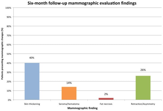 The most common finding on the six-month follow-up mammogram (Figure 4) was the presence of a post-surgical scar with tumor bed clips. Examples of other possible findings, such as skin thickening, are shown in Figure 5. An analysis of all mammographic outcomes at six months is shown in Figure 6. Forty percent of the patients had skin thickening at six months. However, this was generally mild, ranging from 0 mm to only 5.5 mm. Retraction/asymmetry was seen in 26% (n, 11) of the patients, and graded as mild in 9/11. The presence of a seroma/hematoma was reported in 14% of the cases, while fat necrosis was a rare finding present in only one patient at six months.