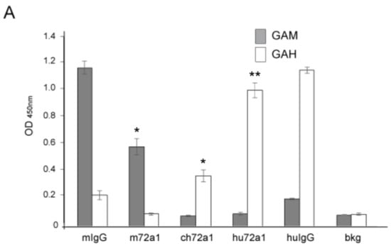 As shown in Figure 2A, m72a1 reacted strongly to GAM (7-fold. p = 0.005) as compared to background (bkg) OD levels but did not react to GAH (0.4-fold over bkg p = 0.7) (Figure 2A). Conversely, chimeric (ch)72a1 and hu72a1 did not react significantly to GAM (0 and 0.1-fold over bkg, p = 0.3 and p = 0.2 respectively, Figure 2A), but did react 4-fold (ch72a1) and 11-fold (hu72a1) to GAH IgG compared to bkg (p = 0.006 and p = 0.001, respectively, Figure 2A). These results indicate that humanization of m72a1 significantly reduced anti-mouse reactivity and increased anti-human reactivity.