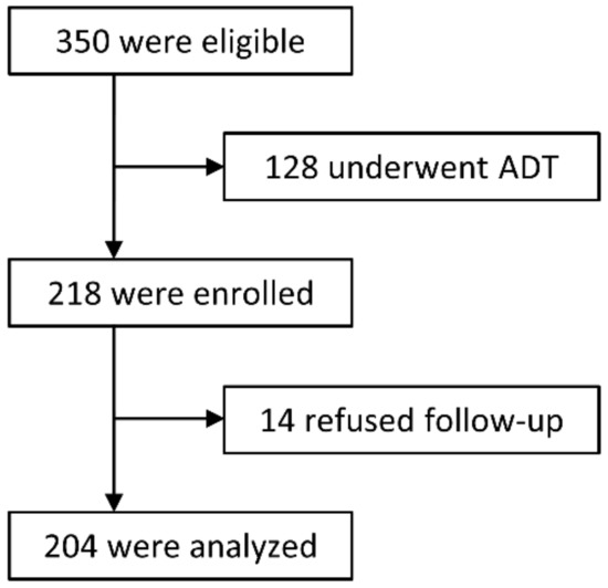 - O’Farrell, S.; Garmo, H.; Holmberg, L.; Adolfsson, J.; Stattin, P.; Van Hemelrijck, M. Risk and timing of cardiovascular disease after androgen-deprivation therapy in men with prostate cancer. J. Clin. Oncol. 2015, 33, 1243–1251. [Google Scholar] [CrossRef] [PubMed]