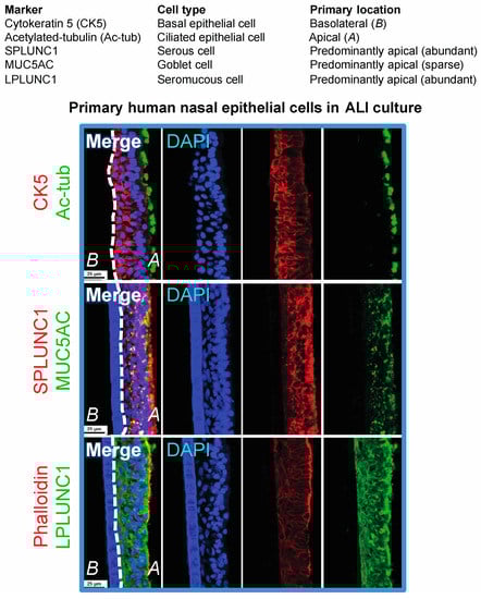 Confocal images of primary human nasal epithelial air-liquid interface (ALI) culture cryosections immunostained for cellular markers. Images were acquired on a Nikon A1 point scanning confocal microscope, processed with NIS Elements, and Z-stack 3D renderings are projected in the x-y plane.