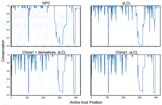 In a subset of NPC samples, it was proposed that nonsynonymous mutations may cluster at the N-terminal transmembrane domains as the C-terminal domains are likely conserved for preservation of LMP1 signaling function [92]. Conservation plots of LMP1 amino acid sequences were grouped by origin (NPC vs. sLCL) and analyzed against a master consensus sequence generated from the combined NPC and sLCL sequences. Due to indels in some of the LMP1 isolates, an ungapped majority-rule consensus sequence was generated to enable comparisons among specimen groups. The conservation plots demonstrate that the coding sequence is relatively well conserved in NPC isolates but is more diverse in sLCL isolates (Figure 3). Apart for specific nucleotides in the N-terminus and one region spanning the C-terminus, the overall conservation in NPC isolates would suggest that evolutionary pressures are imposed on LMP1 in sites other than the signature amino acid loci (S229, R334, del344) that define the China1 strain [84]. All LMP1 sequences in the NPC group were typed to be the China1 strain, but the sLCL group consisted of multiple LMP1 strains [90]. It is plausible that the high overall LMP1 sequence conservation in the NPC group may simply be explained by the prevalence of the China1 strain in NPC tumors [83]. The sLCL samples were further stratified by the LMP1 strain and grouped into sLCLs encoding the China1 strain (China1, sLCL) or, sLCLs encoding China or China1-derivative hybrid LMP1 sequences (China1+derivatives, sLCL). The conservation plots of the China1 sLCL sub-groups demonstrate that LMP1 amino acid residues are more conserved in the NPC group than the sLCL isolates, suggesting that there may indeed be selection for tumor-associated residues even within the China1 clade.
