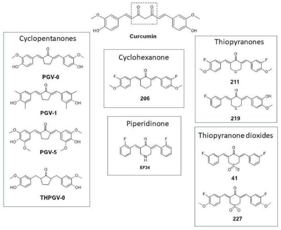 The central conjugated β-diketone linker in curcumin has been identified to contribute to its chemical and metabolic instability [18]. Replacing the conjugated linker with a monocarbonyl cross-conjugated dienone that is embedded within a ring structure has been widely employed as a stabilizing modification. In this report, we explored various structural curcuminoid types that embodied this modification [17,18]. Curcuminoids with five different ring structures were investigated [17,18,19,20], namely cyclopentanones PGV-0, PGV-1, PGV-5, THPGV-0, cyclohexanone 206, piperidinone EF24, thiopyranones 211, 219 and thiopyranone dioxides 41, 227 (Figure 1).
