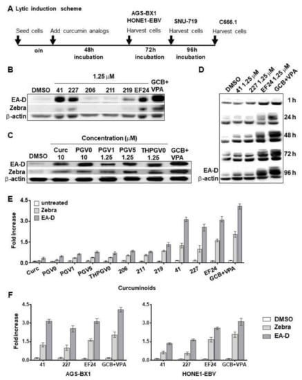 Different lytic induction effects of curcuminoids in gastric (GC) and nasopharyngeal (NPC) carcinoma cell lines carrying recombinant Epstein-Barr virus (EBV) genomes. Curcumin and curcuminoids promote the accumulation of Zebra and EA-D lytic proteins in gastric (AGS-BX1) and nasopharyngeal (HONE1-EBV) carcinoma cells. (A) Experimental scheme representing the curcuminoid treatment of EBV-positive GC and NPC cells; (B) Treatment at 1.25 µM concentration resulted in strong lytic induction effects of hit compounds 41, 227, and EF24; (C) Lytic induction effects of curcuminoids in HONE1-EBV cells; (D) Expression of Zebra and EA-D lytic proteins in AGS-BX1 cells after treatment with 1.25 µM of hit compounds (41, 227, EF24) for 1, 24, 48, 72, or 96 h or no treatment analyzed by immunoblot; (E) The relative level of EBV lytic proteins (Zebra, EA-D) induced by curcuminoids was assessed after normalisation with β-actin as loading control. Results are presented as fold increase of EBV lytic proteins of treated cells compared with untreated cells; (F) The lytic induction effect of hit compounds (41, 227, EF24) is more effective and intense in AGS-BX1 (evidenced by 1.5 to 3-fold increase) compared with that of HONE1-EBV (1.2 to 2-fold increase) cells. AGS-BX1 and HONE1-EBV cells treated with 3 mmol/L GCb and 0.3 mmol/L valproic acid (VPA) were included as positive controls (B–F).