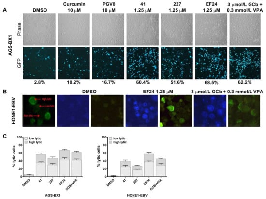 Similar results were found for EBV lytic reactivation as visualized by fluorescence microscopy. Representative images of lytic induction by several curcuminoids in cell lines with recombinant EBV genomes are shown in Figure 3. In agreement with other studies [29,30,31], we found approximately 1–5% of untreated recombinant AGS-BX1 and HONE1-EBV cells to show spontaneous lytic reactivation (Figure 3A,B). To analyze the percentage of cells entering the lytic phase, we counted the number of cells expressing weak and strong green-fluorescence intensity and classified them into two categories; i.e., low and high EBV lytic reactivation (Figure 3B), as shown before [6]. Among curcuminoids, EF24 induced EBV reactivation in AGS-BX1 cells at a comparable level to GCb+VPA (62–69%), whereas curcumin itself induced only 10% of AGS-BX1 cells into the lytic cycle (Figure 3A). Approximately 57% of HONE1-EBV cells exhibited GFP-expressing EBV lytic reactivation by EF24 treatment. The lytic induction by GCb+VPA treatment was less in HONE1-EBV (45%, Figure 3C; right panel) as compared to AGS-BX1 cells (62%; Figure 3C; left panel). This indicates that cell background influences the permissiveness to induce EBV lytic reactivation. In addition, a higher level of spontaneous lytic reactivation of AGS-BX1 indicates that recombinant EBV in GC cells is more susceptible to chemical lytic inducing agents than recombinant EBV in NPC cells [6,12,24,28].