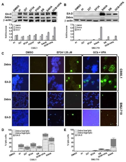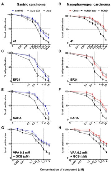 The synergistic killing effect of hit compounds (41, EF24) and GCb+VPA was determined by trypan blue exclusion assay. EBV-positive GC and NPC cells grown to 70% confluence were treated with a combination of hit compound (41, EF24) and GCb+VPA or GCb+VPA alone for 48–96 h depending on cell types (Figure 2A). Treatment with 5 µM SAHA or 3 mM SB was used as positive control [9,24,28]. Results are presented as percentages of viable cell populations among treated cells compared with those of untreated (DMSO) control. Experiments were repeated three times independently.