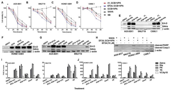 Combination of hit compounds and CLVA regimen synergistically induce EBV lytic cycle, significantly enhanced cell death and expressed apoptosis markers. Synergistic effects of hit compounds and CLVA regimen were measured by MTT assay, immunoblot and RT-qPCR quantification. EBV positive carcinomas: (A) AGS-BX1; (B) SNU-719; (C) HONE1-EBV; and (D) C666.1 cells were treated with hit compounds (41, EF24) in combination with GCb+VPA or GCb+VPA alone for 48–96 h followed by measurement of cell viability relative to untreated cells by MTT assay. Treatment with SAHA and SB were included as controls. Vertical dot line represents treatment time in each cell line; (E) AGS-BX1, SNU-719 and C666.1 cells were treated with a combination of 41 and GCb+VPA or GCb+VPA alone for 48–96 h and the expression of Zebra and EA-D lytic proteins were analyzed by immunoblot. Cellular β-actin served as loading control; (F) HONE1-EBV cells were treated with EF24 and GCb+VPA, GCb+VPA alone or SAHA; (G). EF24 significantly enhanced lytic induction capacity of CLVA regimen in EBV recombinant gastric carcinoma AGS-BX1, but not natural EBV genome-carrying SNU-719 cells. SAHA showed its capacity to induce EBV lytic in SNU-719. (G, right panel); (H) EBV-positive AGS-BX1, SNU-719, HONE1-EBV and C666.1 cells were treated with 5 µM SAHA (lane 1, 3, 5, 7) or EF24 and GCb+VPA in combination (lane 2, 4, 6, 8) for 72 h followed by detection of expression of cleaved PARP and cleaved caspase-3 by immunoblot analysis. AGS-BX1 cells treated by 10 µM EF24 was used as a control (lane 9) and cellular β-actin served as loading control. (I–J) RNA profiling of EBV-positive GC (I) and NPC (J) cell lines treated by either combination of hit compounds (41, EF24) with GCb+VPA or GCb+VPA alone. SAHA and SB treatments were used as positive controls whereas treatment with DMSO was used as negative control. RNA profiling of lytically induced-AGS-BX1 (I, left panel); -SNU-719 (I, right panel); -HONE1-EBV (J, left panel) and -C666.1 (J, right panel) cells showed increased levels of immediate early (Zebra and Rta) and early (PK, TK) lytic transcripts, whereas late lytic (VCA-p18) transcripts remained low or undetectable in all treated GC and NPC cells.