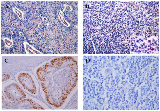 Immunohistochemistry detection of p53 proteins in HL lymph nodes (10× magnification). (A) p53 (mutated and wildtype) protein expression in human colon mucosa (positive control); (B) High p53 protein expression in HRS cells in HL lymph nodes; (C) Phos-p53 expression in human colon mucosa show the functionality of p53; (D) Lack of expression of phos-p53 in HRS cells and all HL lymph nodes, demonstrating the inhibition of p53 in HL lymph nodes.