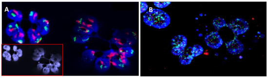Errors of chromosome segregation and micronucleus and nucleoplasmic bridge formation in HL cells detected after four days of culture in the presence of cytocalasine B, an agent that has been most widely used to block cytokinesis and the separation of daughter cells after mitosis (40× magnification). (A) FISH painting of chromosome 9 (red) and 16 (green), showing the presence of defects in chromosome segregation after mitosis and the presence of nucleoplasmic bridges; (B) Telomere (red) and centromere (green) staining, showing the presence of multiple micronuclei with only telomere sequences (terminal deletion) and micronuclei with telomere and centromere sequences (chromosome lagging). In addition, the presence of telomere and centromere sequences in the nucleoplasmic bridge demonstrates the presence of dicentric chromosomes related to telomere fusion and the involvement of breakage-fusion-bridge cycles.