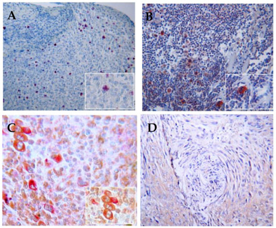 Another candidate that may be involved in HL pathogenesis is the human polyomavirus, JCV, a ubiquitous virus with a seroprevalence in adults of 39–81% [138]. Most people acquire JCV in childhood or adolescence. The etiological role of JCV in lymphoma is still debated [139,140,141,142,143]. We have demonstrated that the prevalence of the JCV antibody is significantly higher in the blood of HL patients than that of NHL patients and controls (data not shown). The presence of T-antigen and agnoprotein has been detected in HL lymph nodes [144] (Figure 3). In addition, the co-activation of JCV and EBV and the presence of rogue cells [145] were observed in the peripheral blood lymphocytes of HL patients and were associated with high a risk of relapse and the mechanisms of “hit and run” [146] in HL was proposed [147].