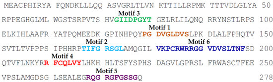 Epstein-Barr Virus deoxyuridine triphosphate nucleotidohydrolase (EBV-dUTPase) amino acid sequence. Typical dUTPase motifs 1–5 and the unique motif 6 characteristic of the Herpesviruses dUTPase family are depicted.