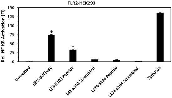 Activation of NF-κB by L83-K103 peptide in HEK293 cells stably expressing TLR2. Cells were transiently transfected with NF-κB luciferase reporter plasmid as we have described [40,43,44]. After 24–36 h, cells were treated with wild-type EBV-dUTPase, EBV-dUTPase peptide L83-K103, scrambled peptide L83-K103, EBV-dUTPase peptide L174-S194, scrambled peptide L174-S194 (10 μg/mL), zymosan (10 μg/mL), or left untreated for 8 h and luciferase reporter gene activity was measured. Values represent the mean fold induction (FI) ± SD relative to control (n = 3). Values represent the mean fold induction (FI) ± SD relative to control (n = 3). * p < 0.05 (Groups compared: wild-type dUTPase or synthetic peptide treated vs. untreated).