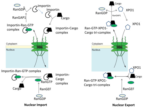 Nuclear transport machinery. An import complex consisting of a nuclear localization signal (NLS)-bearing cargo and an Importin is formed in the cytoplasm. After translocation through the nuclear pore complex, Ran-GTP displaces the cargo from the importin, resulting in nuclear cargo release. The importin–Ran-GTP complex returns to the cytoplasm through the Nuclear Pore Complex (NPC) where the Ran GTPase-activating protein (RanGAP1) stimulates GTP hydrolysis, releasing the Nuclear Transport Receptor (NTR) for another import cycle. Nuclear export cycles require the formation of a trimeric cargo–XPO1–Ran-GTP complex in the nucleus. After NPC passage, this complex dissociates due to Ran-GTP hydrolysis, releasing the cargo into the cytoplasm. This figure is adopted from the figure in the article by Marion Weberruss and Wolfram Antonin [25]. This is an Open Access article distributed under the terms of the Creative Commons Attribution License (http://creativecommons.org/licenses/by/3.0), which permits unrestricted use, distribution and reproduction in any medium provided that the original work is properly attributed.