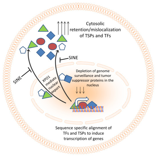 Nuclear export machinery as a therapeutic target. Genome surveillance and tumor suppressor proteins need to align to DNA in a sequence-specific manner in order to coordinate their surveillance and tumor suppressive function. In cancer, the excessive export of these TSPs results in their accumulation in the cytosol and functional inactivation. Specific inhibitors of nuclear export (SINE) compounds can block the nuclear export and restore TSPs in the nucleus of cancer cells leading to activation of tumor suppressive function.