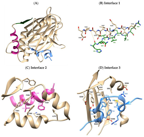 Structure of the hYAP50–171-hTEAD1209–426 complex (PDB 3KYS) (A) [32] with three interfaces between hYAP50-171 in green (B), cyan (C) and blue (D) and hTEAD1209-426 (in light brown).
