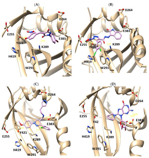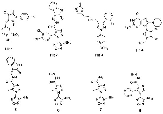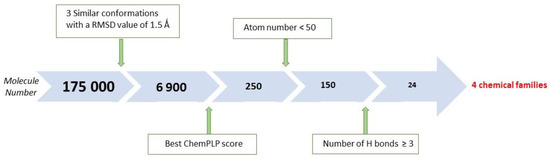 Our virtual screening (Scheme 1) was based on hTEAD1209–426 structure and molecules were docked into the binding cavity formed by the C-terminal hTEAD1 region contributing to interface 3. Moreover, all TEAD isoforms display a high sequence homology in the C-terminal domain [30], making the simultaneous targeting of all TEAD isoforms possible. We used the ZINC database, a freely available database of commercially available compounds in ready-to-dock 3D formats. First, filters were applied to the compounds to exclude any potential toxic ability and to enrich the library with the most relevant protein–protein interaction (PPI) inhibitors [36,37]. A molecular weight of >400 Da was applied to the ZINC database, followed by a previously developed Bayesian model on the basis of 42 topological descriptors and 2D fingerprints. This led to the selection of a subset of the ZINC database of 750,000 compounds. Amongst them, the first 175,000 were used for an initial screening run. The binding site was defined as a sphere centered on residue K289 at interface 3. Its radius was set to 12 Å in order to include specific residues identified by directed mutagenesis. Ligands were submitted to 100,000 docking operations with a maximum number of ten final poses and with an early calculation termination if three poses were generated within a RMSD (root-mean-square deviation) of 1.5 Å. This constraint led to a decrease in candidate compounds to 6900. Next, the best ChemPLP scored pose was retained for each compound, giving a set of 250 compounds. A score per atom was also calculated by dividing this score by the number of heavy atoms in the compound. The 150 remaining compounds were then ranked according to their propensity to establish hydrogen bonds with the residues of the TEAD binding site and 24 compounds with a number of H-bond donors/acceptors ≥3 were retained. Finally, an inspection of the structures led to four candidates. They were retained for their structural diversity, chemical feasibility and also their apparent best fitting into the binding cavity. Figure 2 and Figure 3 show the structures of the four virtual hits and their docking poses in the TEAD binding pocket using the UCSF Chimera software, respectively.
