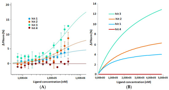 Except for hit 4, the three other hits stabilized hTEAD2217–447 protein with ΔTm values around 3.5–4.0 °C, comparable to that of niflumic acid (Supplementary Figure S1). In our hands, niflumic acid (ΔTm = 3.5 °C) displayed a better affinity toward hTEAD2217–447 than that reported by Pobbati A. V. et al. (ΔTm = 0.6–1.8 °C) at the same protein concentration [28]. This slight difference might be related to the compound concentration, which in our case is at least two-fold higher (50–250 μM) than that used by Pobbati A. V. et al. (20 μM). Thermal shift data were also recently published by Mesrouze Y. et al. which measured a positive thermal shift of 7.4 °C induced by the binding of hYAP51–99 (20 μM) to hTEAD4217–434 (1–2 μM) [38]. Thus hTEAD4217–434 was better stabilized by hYAP51–99 (a shortened fragment of YAP50–171, showing the same binding affinity as the whole TEAD-binding region of YAP [32]) than hTEAD2217–447 by our molecules. This undoubtedly reveals a lower affinity of our hits. These first results led us to obtain more quantitative data about the interaction between our hits and the hTEAD protein and, herein, we report for the first time a study using microscale thermophoresis (MST) on GFP-labeled hTEAD2217–447 in CHO-K1 cell lysate. So far ITC or SPR experiments performed to investigate the interaction of potential TEAD binders with TEAD protein were done on isolated purified TEAD proteins (or TEAD fragments). In presence of GFP-labeled hTEAD2217–447 in CHO-K1 cell lysate, the measured Kd values of our hits will be closer to those occurring in physiological conditions.