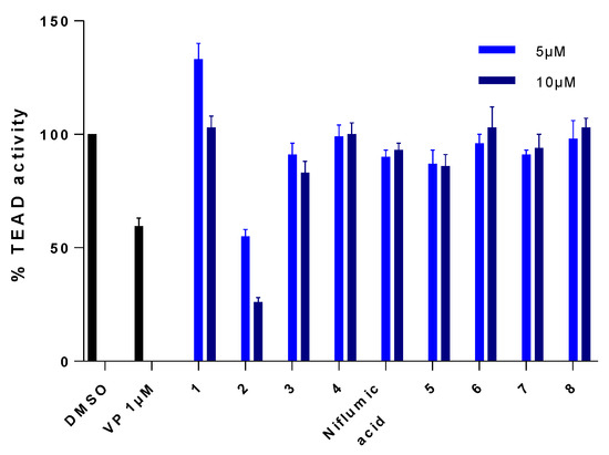 Fitting of the binding curves by a linear Kd model (Figure 4B) led to a better appreciation of the saturation phase for hits 1 and 2 than by the Kd model (Figure 4A). Kd values above 300 μM for compounds 1–3 (392, 650 and 363 μM, respectively) were determined. We next inquired if the in vitro TEAD binding of these three hits revealed by TSA and MST tests would have biological consequences in cellular assays. Firstly, we measured the TEAD transcriptional activity in transfected HEK293T cells in the presence of our compounds using a TEAD reporter construct. A luciferase reporter is placed downstream of TEAD sites; therefore, the expression level of luciferase correlates with TEAD transcriptional activity. We observed a significant decrease in luciferase expression levels in the presence of compounds 2 and 3 (Figure 5; Table 1) at 5 and 10 μM concentrations. The most important decrease was observed with compound 2 (10 μM) with a residual luciferase activity of 36%. At the same concentration, residual luciferase activities were 80% and 86% for compound 3 and niflumic acid, respectively. Interestingly, compound 2 emerged as the most potent compound in the luciferase assay, with an IC50 value of 6.5 μM (Figure 6), followed by compound 3 and niflumic acid. Compound 2 at a 5.0 μM dose inhibited to 60% the TEAD transcriptional activity in a manner similar to verteporfin at 1.0 μM (Figure 5).