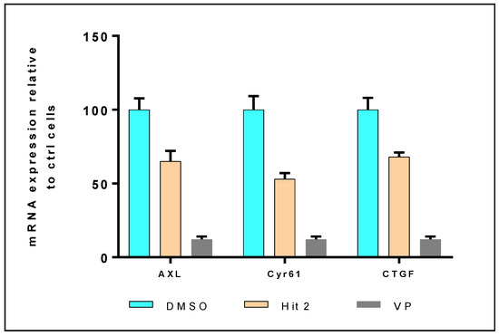 Finally we focused on the effect of compound 2 on YAP-TEAD target genes. We selected MDA-MB-231 breast cancer cell line because it similarly expresses YAP and TAZ co-activators, presents a high TEAD transcriptional activity [21] and yields a high expression of gene targets (AXL, Cyr61 and CTGF) [21,22]. We analyzed (by RT-qPCR) the expression of mRNAs of the downstream gene targets AXL, Cyr61 and CTGF (Figure 7). Compound 2 induced a decrease of 35, 47 and 32% for AXL, Cyr61 and CTGF mRNAs expression, respectively whereas verteporfin (VP) was more efficient with 88% inhibition for the three gene levels.