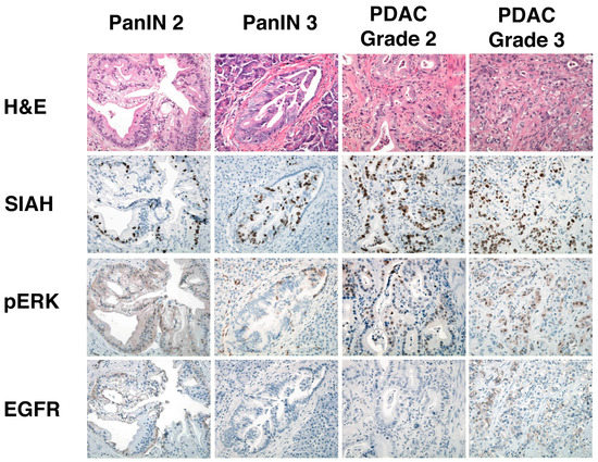 Using anti-SIAH monoclonal antibodies (mAb), we examined the expression of SIAH in pancreatic intraepithelial neoplasias (PanIN) and pancreatic ductal adenocarcinoma (PDAC) [170]. Immunohistochemical (IHC) staining revealed that SIAH is expressed exclusively in proliferating tumor cells, while it is completely absent in the normal pancreas and nonmalignant TME cells (Figure 4). SIAH expression was predominantly nuclear and it increased with increased tumor grade and pathological stage (Figure 4). In comparison to several known biomarkers in the RAS signaling pathway, SIAH is a robust and tumor-specific biomarker that specifically decorates cycling pancreatic tumor cells. In contrast, there is a lack of consistency in tumor-specific staining of two main RAS pathway biomarkers: phospho-ERK sporadically decorated some tumor cells as well as some tumor-associated stromal cells, while EGFR decorated a small subset of PDAC tumor cells (Figure 4) [170].