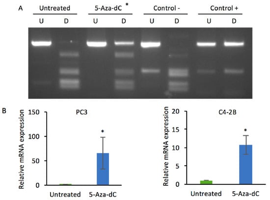 Prostate cancer (PCa) is the most commonly diagnosed cancer and the second cause of cancer-related deaths among men in the U.S. [1]. Survival rates in the last five years have improved as a result of improved earlier diagnosis and the implementation of prostate specific antigen (PSA) test screening. First line treatment includes androgen receptor (AR)-directed therapies, since most tumors express AR and depend on its signaling. However, many patient tumors become resistant after hormone-therapy and relapse within 24 months, developing castration-resistant PCa (CRPC) [2], highlighting the need for novel therapies and treatments targeting alternative signaling pathways involved in PCa progression. Recent studies have demonstrated that epigenetic alterations, particularly changes in gene promoter methylation, are frequent during PCa tumorigenesis [3]. Cancer genomics studies have identified recurrently mutated genes and mutation hotspots in a number of cancer types. However, such studies in prostate adenocarcinomas have identified no genes recurrently mutated in more than a seventh of cases [4]. The biological, and hence clinical behavior, of prostate adenocarcinomas may therefore be determined by variations in the levels of expression of a range of genes, regulated by epigenetic mechanisms. Epigenetic aberrations play an important role in the pathogenesis of the majority of cancers, and one of the most widespread and powerful mechanisms is gene silencing through DNA methylation [5]. DNA methylation is a chemical process defined as the covalent addition of a methyl group to the 5′ carbon of a cytosine nucleotide, leading to the formation of 5-methylcytosine within the so-called CpG dinucleotides [6]. CpG dinucleotides are usually located in clusters named CpG islands, commonly found in the promoter regions of genes, and their hypermethylation results in the repression of gene transcription by further direct and indirect mechanisms [5,7,8]. The detection of DNA methylation changes in cancer genomes can highlight genes that may provide evidence of deregulated signaling networks and pathways, as well as potential candidates for biomarker development. The process of DNA methylation is tightly regulated by DNA methyltransferases (DNMTs) and DNA demethylases, respectively [9]. The DNMT family includes DNMT1, DNMT3 (DNMT3A, DNMT3B), and DNMT3L [8]. DNMT3A and DNMT3B are de novo methyltransferases that function independently of replication and initiate methylation at CpG sites on unmethylated and/or hemi-methylated DNA [10]. On the other hand, DNMT1 is a maintenance methyltransferase that acts during replication and has a preference for hemi-methylated DNA [11]. Demethylation is carried out by the ten-eleven translocation (TET) family of DNA hydroxylases, which regulate demethylation by oxidizing 5-methylcytosine to 5-hydroxymethylcytosine and further derivatives and are deregulated in many cancer, including prostate cancer [12].