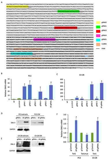 CRISPR-mediated induction of DKK3. (A) DKK3 gene promoter with the positions of gRNAs, PAM sequences (underlined) and translation start (blue). (B,C) Q-RT-PCR analysis of DKK3 mRNA expression in PC3 (B) and C4-2B (C) cells 48 h after transfection with dCas9-VPR and the indicated gRNAs; graphs show mean ± SD of triplicate wells, n = 5. * p < 0.05 versus control gRNA, one-way ANOVA and two-tailed Student’s t-test. (D,E) Western blots of cell lysates (extracts) and conditioned media (CM) from PC3 (D) and C4-2B (E) cells 5 d after transfection with dCas9-VPR and control gRNA (gRNA-C) or DKK3 gRNAs 1, 2, 3, 4 and 5 together (All-gRNAs) and treated for the first two days with 1 μg/mL puromycin, were probed for Dkk-3 and GAPDH. (F) DKK3 mRNA expression in PC3 and C4-2B cells after transfection with dCas9-Tet1CD (Tet1) or the inactive mutant (Tet1mut); graphs show mean ± SD of triplicate wells, n = 4; * p < 0.05 versus control gRNA, two-tailed Student’s t-test.