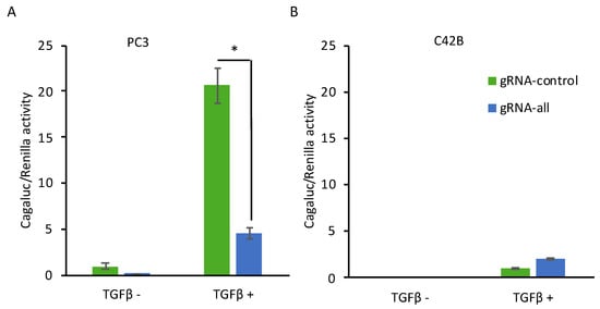 CRISPR-mediated induction of Dkk-3 inhibits TGF-β signaling in PC3 cells. (A,B) Gene reporter assays using PC3 (A) and C4-2B (B) cells transfected with CAGA12-luciferase, renilla, dCas9-VPR and either gRNA-control (gRNA-C) or DKK3 gRNAs (gRNA-all). TGF-β1 (2 ng/mL) was added 24 h after transfection and reporter activity was measured after 24 h. Graphs show mean CAGA luciferase/renilla activity, relative to untreated gRNA-control cells. * p < 0.05, two-tailed Student’s t-test, n = 3.