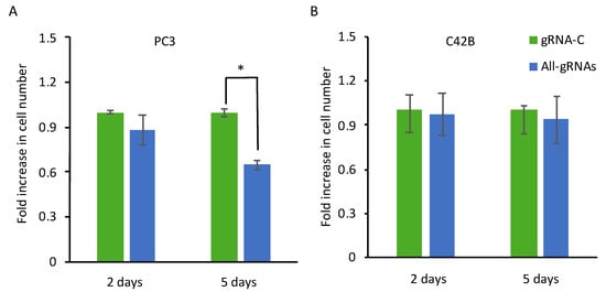 CRISPR-mediated induction of Dkk-3 reduces PC3 but not C4-2B cell number. (A,B) Crystal violet assays for PC3 (A) and C4-2B (B) cells transfected with dCas9-VPR and control (gRNA-C) or DKK3 (All-gRNAs) gRNAs after two or five days. Values shown represent the average fold change, relative to gRNA-C cells at each time point, ± SD of triplicate wells (n = 3). * p < 0.05, two-tailed Student’s t-test.