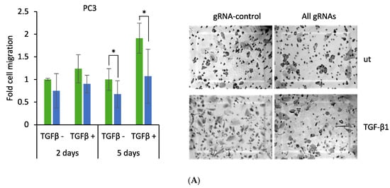 Given the effect of CRISPR induction of DKK3 on TGF-β-dependent transcriptional activity, we wished to determine if it also had an impact on TGF-β-dependent prostate cancer cell migration. To this end, cells were transfected, cultured for one or four days and then plated in inserts in serum-free media with or without TGF-β, and with medium containing 10% FCS in the lower chamber. After 24 h, migrated cells were stained and counted. CRISPR induction of DKK3 did not significantly affect the migration of PC3 (Figure 5A) or C4-2B (Figure 5B) cells when they were cultured for one day prior to plating for migration assays. However, when transfected cells were cultured for four days prior to plating, expression of dCas9-VPR and DKK3 gRNAs significantly reduced TGF-β-dependent migration (Figure 5A). A reduction was also observed both in the absence of exogenous TGF-β, possibly reflecting inhibition of autocrine TGF-β signaling. In contrast, there was no significant effect on C4-2B cell migration (Figure 5B). Equal numbers of viable cells were plated in each case, so the effect on cell migration was not a result of a reduction in cell number. These results indicate that activation of endogenous DKK3 expression inhibits PC3 but not C4-2B cell migration, in keeping with its effects on TGF-β signaling in these cell lines.