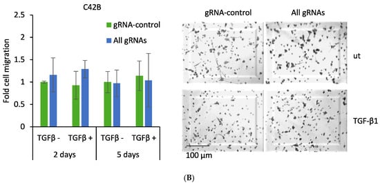 Gene reporter assays were carried out using pGL3-CAGA12-luc and pRL-TK as previously described [24]. Briefly, 200,000 cells/well were plated in triplicate for each treatment in 12-well plates and transfected on the following day with gRNA, dCas9-VPR, 100 ng pRL-TK, and 400 ng CAGA-luc per well. After 5 h, an equal volume of medium containing 20% FCS and P/S was added. After 24 h, cells were treated with TGF-β1 (2 ng/mL) or the same volume of PBS. Cells were incubated for 24 h and then washed in cold PBS and lysed in 250 μL 1× passive lysis buffer (Promega UK, Southampton, UK), frozen and thawed, centrifuged at 15,000 rpm for 5 min and subjected to luciferase assays using the Dual-Glo® luciferase assay kit (Promega), according to manufacturer’s instructions, using a Vector Light 1420 luminometer. For proliferation assays, cells were plated in triplicate for each time point (2 days: 200,000 cells/well; 5 days: 50,000 cells/well) in 12-well plates in complete RPMI medium. On the next morning, cells were transfected with gRNAs and dCas9-VPR as above. After 2 d or 5 d, cells were washed in PBS, fixed in ice-cold methanol (1 mL/well) for 20 min and allowed to dry for 30 min. Subsequent staining was performed using 0.2% crystal violet in 20% methanol (1 mL/well) for 20 min. A volume of 0.3 mL 10% acetic acid was added to the wells to elute the dye and 100 μL of the suspension was transferred to a 96-well plate. Optical density (OD) was measured in a plate reader at (Molecular Devices) at 595 nm. For migration assays, cells were plated in a 6-well plate at a density of 200,000 cells/well for the short time-point (2 d) or 50,000 cells/well for the long time-point (5 d). The day after plating, cells were transfected as above. For the short time point, cells were trypsinized after 24 h, while for the long time-point this was after 4 d. Cells were centrifuged at 500× g for 5 min and resuspended in 2 mL serum-free RPMI medium ± 2 ng/mL TGF-β1. 50,000 cells were plated on 8 μm pore Falcon Transwell® polycarbonate membrane inserts (Scientific Laboratory Supplies Ltd., Nottingham, UK) in a 24-well plate, in duplicate for each treatment and transfection condition. 800 μL of complete medium was added to the outside of each insert. Cells were allowed to migrate for 24 h at 37 °C, and those that had not migrated were removed with a cotton bud. The inserts were washed in PBS and cells fixed in cold methanol (1 mL/insert) for 20 min, allowed to dry for 30 min and then stained with 0.2% crystal violet in 20% methanol (600 μL/insert) for 30 min. Inserts were washed in distilled water and seven pictures were taken for each insert at 200× magnification using a Nikon Eclipse TE200-U and QCapture software (Qimaging Inc., Surrey, BC, Canada). Migrated cells were counted using Image J and the average numbers of migrated cells calculated for each insert. This value was normalized by dividing the number of migrated cells by the OD reading at 595 nm from additional wells of cells that had been plated in parallel without inserts to control for effects on cell number.