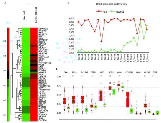 Analysis of the methylation status of the promoters of these genes in PC3 cells using Gene Expression Omnibus (GEO) (ncbi.nlm.nih.gov/geo/) indicated that DKK3, SLC16A5, PTGS2, HFE, and TGFBI had β-values > 0.5, while CYP27A1, ANXA2, and FZD8 had β-values < 0.35. For the DKK3 promoter (Figure S3) the average β-values were 0.86 and 0.18 in PC3 and RWPE1 cells, respectively (Figure 6B). Analysis of these genes in patient samples from the TGCA dataset using the MethHC database (methhc.mbc.nctu.edu.tw) confirmed significant hypermethylation of the DKK3, PTGS2, SLC16A5, HFE, and CYP27A1 promoters in prostate tumors, compared to normal prostate. ACTG2 and ECM1 were also more highly methylated in tumors than in normal prostate, but from a high basal level, while TGFBI and ANXA2 were more highly methylated in tumors, but from a low basal level in normal prostate. NKD1 and FZD8 were only very weakly methylated both in patient tumors and in normal prostate (Figure 6C).
