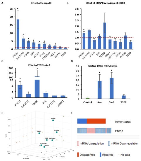 Q-RT-PCR analysis of the expression of the indicated genes in PC3 cells (A) treated with 5_Aza-dC for 72 h, (B) transfected with dCas9-VPR and control gRNA or DKK3 gRNAs for 48 h and (C) treated with TGF-β1 for 24 h. (D). Q-RT-PCR analysis of the expression of DKK3 in PC3 cells under the indicated conditions. Graphs show mean expression relative to control (dashed red lines indicate control level set to 1) ± SD, n = 3 to 5, * p < 0.05 two-tailed Student’s t-test. (E) 3D plot illustrating the effects of decitabine, CRISPR induction of DKK3 and TGF-β1 on the indicated genes. (F) Comparison of tumors with changes in PTGS2 expression (up, red; down, blue) and disease-free status of patients, from cBioPortal using the MSKCC 2010 dataset [45].