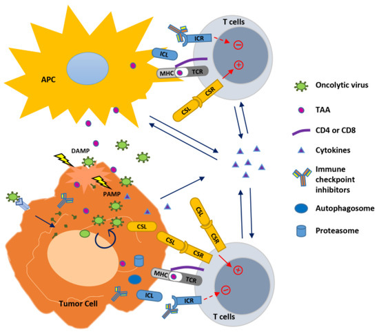 Strategies to improve oncolytic virus-mediated anti-tumor immunity. Oncolytic viruses (OVs) infect and replicate inside cancer cells, resulting in cell lysis and propagation of virions to infect nearby cancer cells. This process generates pathogen-associated molecular patterns (PAMPs) and damage- (or danger-) associated molecular patterns (DAMPs) that trigger an innate immune response to modulate the tumor microenvironment, resulting in in situ autovaccination leading to adaptive anti-virus and anti-tumor immunity. In the infected tumor cells, OVs also induce autophagy (autophagosome formation) and activity of proteasome to increase their capability to function as APC to present tumor-associated antigens (TAAs) to T cells. OVs have been combined with immune modulators to enhance immunity against the tumor. Cytokines expressed by OVs stimulate innate and adaptive immunity within the tumor. Combination of OVs with immune checkpoint blockade through antibodies to inhibit the interaction between immune checkpoint ligand (ICL) and receptor (ICR), or with agonist antibody or expression of the co-stimulatory ligand (CSL) to bind with the co-stimulatory receptor (CSR) augments T cell receptor (TCR) signaling initiated by the virus through presenting TAAs with major histocompatibility complex (MHC), leading to enhanced T cell activation against the tumor.