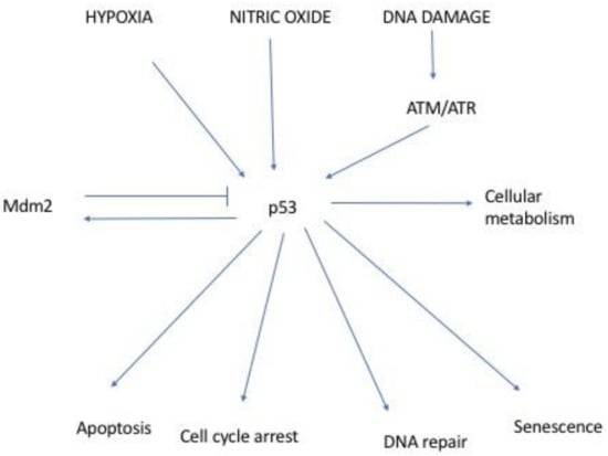 A salient observation in cancer biology has been that TP53 is frequently mutated in many human tumours [1,2]. p53 protein was identified in SV40 transformed cells where it was associated with Large T Antigen. It was later discovered to be a prominent transcription factor whose function is essential in preventing inappropriate cell proliferation and maintaining genome integrity following genotoxic stress (Figure 1) [2,3]. Consequently, in response to cellular stress such as DNA damage, hypoxia, oncogene overexpression and viral infection, the p53 protein expression level is augmented. Post translational modifications, which include phosphorylation, acetylation, ubiquitination, and methylation, stabilize p53 enabling it to activate multiple promoter elements of target genes affecting cellular processes such as cell cycle arrest, senescence, and apoptosis [2,4].