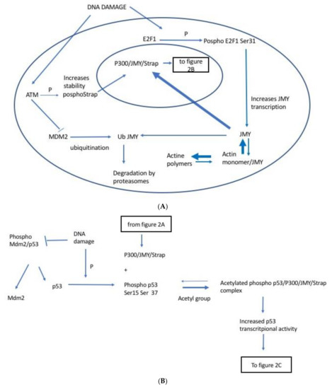 Figure 2. JMY (Junctional Mediating and Regulating Y protein)/P53 interaction pathway. (A) JMY’s regulation. In unperturbed cells, JMY levels are maintained at a constant state by a balance between transcription and degradation. The latter is controlled by Mdm2 which ubiquitinates JMY leading to its degradation by proteasomes. Following DNA damage, the newly phosphorylated E2F1 induces increased transcription of JMY, while ataxia-telangiectasia mutated (ATM) dampens MDM2 activity. Furthermore, actin monomers form polymers and therefore are no longer available to bind to JMY and sequester it in the cytoplasm. Since it is no longer bound to actin monomers, JMY can then bind to Importin and translocate to the nucleus. This causes the levels of JMY in the nucleus to increase and form a complex with P300. Stability of this complex is further increased by linkage with phosphorylated Stress responsive activator of p53 (Strap). Based on: [18,19,20,21,22]. (B) JMY’s effect on p53. Following DNA damage, p53 is phosphorylated and escapes degradation resulting in upregulation of p53 levels. Phosphorylated p53 binds to the JMY/p300/Strap complex and its transcriptional activity increases. Based on: [9]. (C) Formation of molecular complexes and their effects on apoptosis and cell cycle. Following DNA damage, p53 is phosphorylated and released from MDM2. It binds to the p300/JMY/Strap complex which causes acetylation of five Lysine residues located on the C terminus region of p53. This leads to an increased ability of p53 to transcribe Bax, but not p21, resulting in a preferential activation of the apoptotic pathway over cell cycle arrest. However, when PRMT5 is recruited to Strap that is bound to the JMY/p300 complex, this triggers the methylation of p53 shifting the process away from Bax transcription and apoptosis to increased transcription of p21 and induction of cell cycle arrest. PRMT5 further reinforces this switch by E2F1 inhibition via methylation which reduces JMY’s transcription. Based on and modified from: [9,23,24,25,26,27].