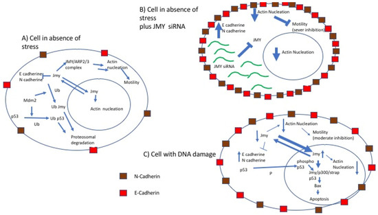 JMY’s capacity to regulate cell motility and DNA damage response suggest that JMY could be the link between these two cellular processes. In the model, currently being explored (illustrated in Figure 3), following DNA damage, the net JMY concentration in the cytoplasm diminishes while its level in the nucleus increases as JMY translocates into the nucleus. In the nucleus most of the JMY is sequestrated by the Cp300/Strap/p53 complex to help stabilize p53. As a consequence, there is limited JMY protein available for actin nucleation and cadherin inhibition, which also implies a limited mobility for cells [11,22,35,36].