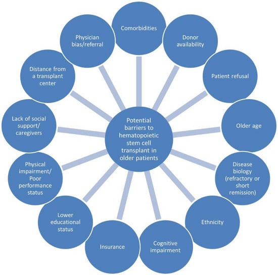 Acute myeloid leukemia (AML) is a disease that primarily affects adults aged 65 years and above; the median age of patients at diagnosis is 68 years [1]. The estimated five-year survival in older adults with AML is poor at less than 5% [2]. The dismal prognosis in an older population is attributed to a variety of host and disease factors including high prevalence of comorbidity, frailty, poor functional status, unfavorable cytogenetics, greater resistance to leukemia-directed treatment, and higher rate of treatment-related toxicities [3,4]. Older patients are also more likely to have secondary AML related to antecedent hematologic disorders with consequent poor response to standard chemotherapy [5]. Allogeneic hematopoietic cell transplantation (allo-HCT) is a potentially curative therapy for patients with intermediate- or high-risk AML or those who fail to enter complete remission after one to two cycles of induction chemotherapy [6]. Older patients, historically, had not been considered for allo-HCT due to frequent comorbidities and perceived higher risk of treatment-related mortality and non-relapse mortality [7]. Recently, however, there is increasing data that support the utility of allo-HCT in fit older patients after intensive chemotherapy resulting in improvement of outcomes [8]. Despite this, less than 6% of older patients receive allo-HCT, which is partially attributed to the reluctance of physicians to transplant these patients and the challenges associated with the selection of transplant candidates [9]. Figure 1 shows the possible barriers to hematopoietic stem cell transplantation in older patients with AML.