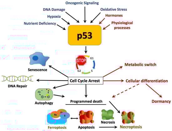 p53 canonical and non-canonical tumor suppressor roles of p53. p53 is activated by a range of cellular stress signals. These activators of p53 include nutrient stress, hypoxic conditions, activation of oncogenes, DNA damage, and oxidative stress from reactive oxygen species (ROS) and, as a result, increase the activity of p53. Classical or canonical responses of p53 include, transcriptionally and translationally, cell cycle arrest and repair damage to DNA, which place the cell in a state of senescence or induce apoptosis. Non-canonical, controlled programmed cell death roles include autophagy pathways, necrosis, necroptosis, and ferroptosis [,,,,,,,,]. Normal physiological processes such as hormone activation can also lead to p53-induced cell cycle arrest and p53 acts as a switch in metabolic process involved in differentiation, redirecting specialized cell function [].