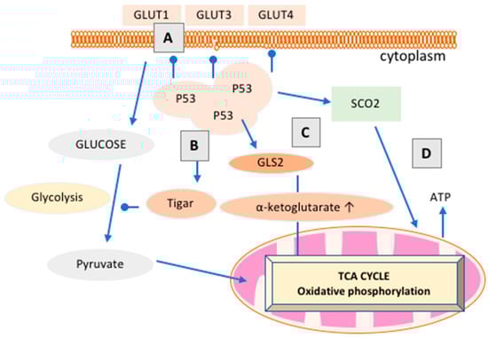 p53 balances glycolysis and mitochondrial respiration. The roles of p53 in cancer metabolism include: (A) suppressing the first step of glycolysis by direct downregulation of glucose-type transporters (GLUT) including GLUT 1, GLUT3, and GLUT4 receptors, which are typically overexpressed in the membranes of cancer cells to facilitate glucose flux [,]; (B) negative regulation of glycolysis by increasing expression of TP53-induced glycolysis regulator (TIGAR) []; (C) regulation of glutaminase-2, leading to an increase in the metabolite α-ketoglutarate. This, in turn, promotes the TCA cycle and mitochondrial respiration []. (D) The upregulation of the cytochrome C oxidase (COX) complex, via p53 targeting the cytochrome c oxidase assembly protein, increases mitochondrial respiration. COX is a vital transmembrane protein that accepts oxygen in mitochondrial respiration []. This figure has been adapted from [].
