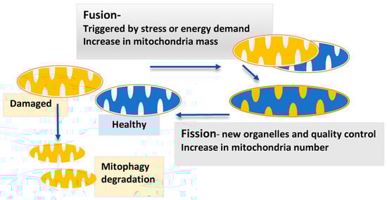 Mitochondrial fission–fusion cycle sustaining mitochondria function, number and genetic health. Under stressful or energy-demanding conditions, mitochondria undergo fusion to complement damaged (yellow) and healthy (blue) mitochondria. This allows for a mixing of constituents alongside increasing membrane surface area, which optimizes bioenergetic functioning. An imbalance between fission and fusion—for instance, greater fission—leads to mitochondrial fragmentation and may increase the number of mitochondria if mitophagy does not eliminate mitochondria. Conversely, more fusion is seen to form large tubular networks. The biogenesis of mitochondria occurs to increase mitochondrial biomass or compensate for mitochondrial degradation. Thus, imbalances between mitochondrial fission, fusion, biogenesis, and degradation appear to regulate the mitochondrial number, shape, size, and biomass [,]. Mitochondrial fission has been associated with sensitizing cells to apoptosis during highly stressful conditions and with environments of nutrient excess. However, fission has also been implicated in the “housekeeping” of mitochondria to produce new mitochondria (blue) and remove old/damaged mitochondria.